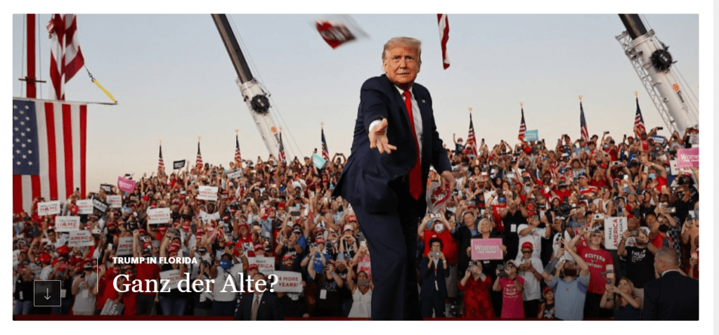 The german web-publication FAZ – among many other newsmedia around the world that are constantly howling about Trump – gives a report from the actual Trump campaign: : “Seine künstliche Bräune verdeckte jede etwaige Erschöpfung nach der Coronavirus-Infektion und die zumeist maskenlosen, dicht gedrängten Fans boten die optische Illusion einer überstandenen Krise.”